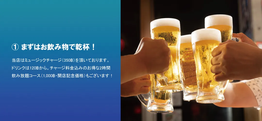 当店はミュージックチャージ(350฿)を頂いております。ドリンクは120฿から。チャージ料金込みのお得な2時間飲み放題コース(1,000฿・開店記念価格)もございます!