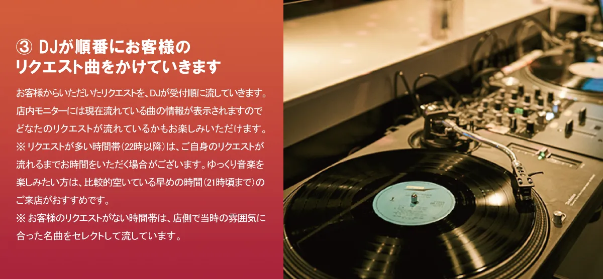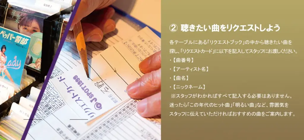 各テーブルにある「リクエストブック」の中から聴きたい曲を探し、「リクエストカード」に以下を記入してスタッフにお渡しください。